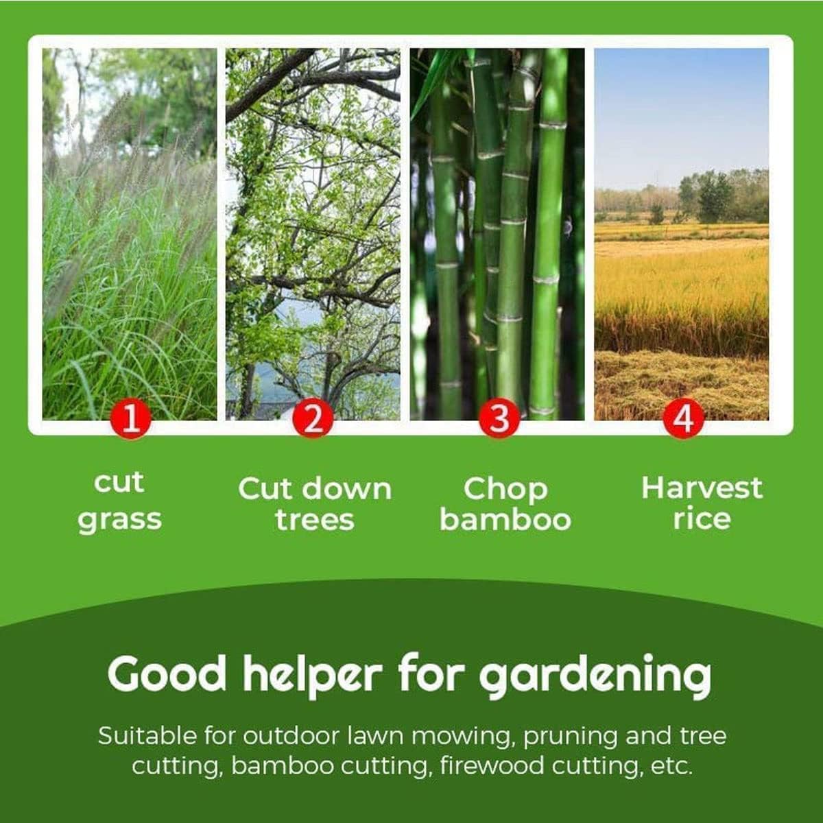 Wide range of uses: The double-edged sickle is suitable for outdoor mowing grass, cutting vines, pruning trees, cutting bamboo, chopping wood, harvesting rice, etc, bringing you a relaxed and comfortable working experience.
